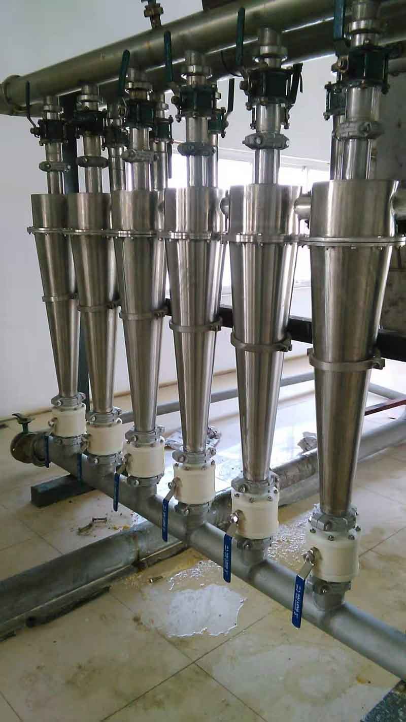 作为离心力与重力复合力场的典型设备,因其结构简单、占地面积小、安装操作方便、运行成本低等优点而被广泛地用于诸多领域。旋流器的基本原理是将具有一定密度差的液-液、液-固、液-气等两相或多相混合物在离心力的作用下进行分离。将混合液以一定的压力切向进入旋流器,在圆柱腔内产生高速旋转流场。混合物中密度大的组分在旋流场的作用下同时沿轴向向下运动,沿径向向外运动,在到达锥体段沿器壁向下运动,并由底流口排出,这样就形成了外旋涡流场;密度小的组分向轴线方向运动,并在轴线形成一向上运动的内涡旋,然后由溢流口排出,这样就达到了两相分离的目的。