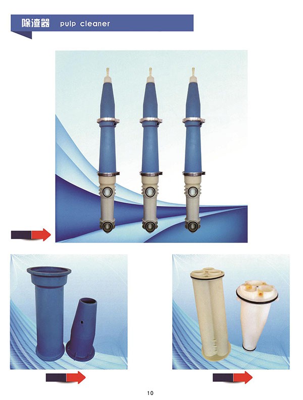 造纸工业中的一种纸浆净化除渣设备。外形是约8~13度圆锥角的圆锥体,由不锈钢、硬橡胶或内衬聚乙烯基塑料层的铸铁等材料制成。内壁平滑光洁,耐磨、耐压、耐腐蚀,在40~60℃的温度下不变形。利用涡旋运动除去较重的杂质。除渣效率较涡流除渣器高,能显著降低纸浆的尘埃度。且可成束或成排并联,尾渣可分段再选,减少纸浆除渣的损失。